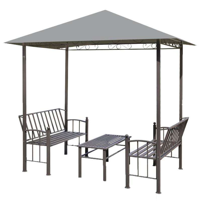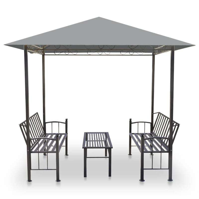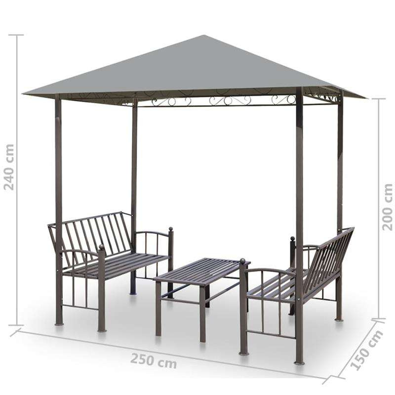 W skład zestawu wchodzi pawilon ogrodowy z solidną, stalową ramą oraz odporne na działanie wody i promieni UV zadaszenie ze wzmocnionymi rogami, które ochroni Twoich gości przed palącym słońcem. Ławki i praktyczny stolik wykonano ze stali, która zapewnia wysoką trwałość. Lekko odchylone oparcia oferują wygodne miejsce do siedzenia. Zaokrąglone elementy ozdobne dachu sprawiają, że cała konstrukcja zyskuje elegancki urok.