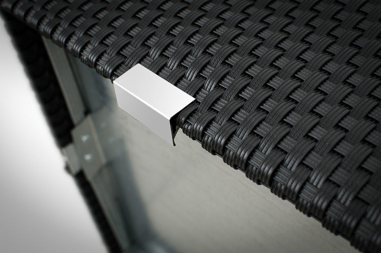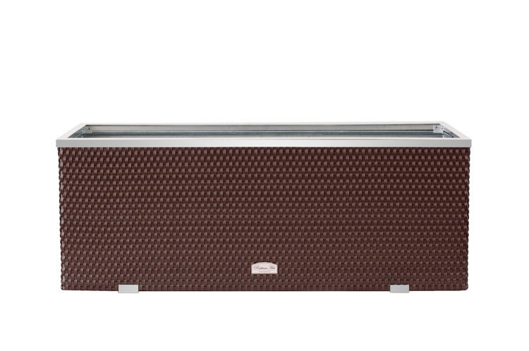 Wykonana z wysokiej jakości plecionego technorattanu. Wnętrze wykończone blachą ocynkowaną. Donica posiada dwie ozdobne listwy boczne na bokach oraz górne wykończenie wykonane z aluminium polerowanego.