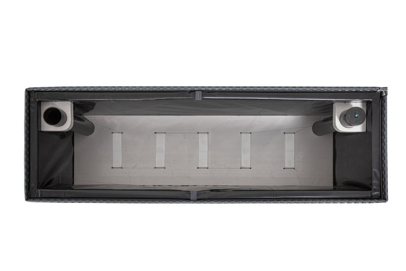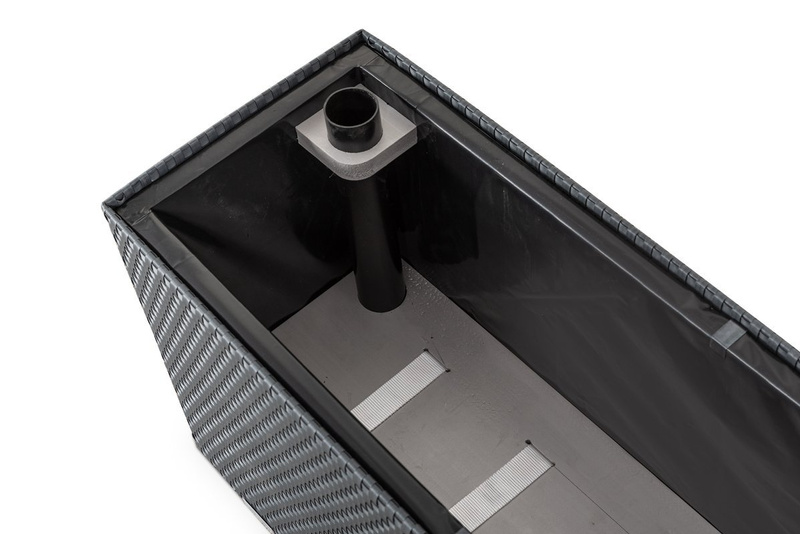 Dodatkowo donica wyposażona jest w system inteligentnego nawodnienia, który zapewnia roślinom stały dostęp do wody. Wbudowany zbiornik na dnie donicy, pokryty warstwą styroduru, umożliwia stopniowe nawadnianie dzięki specjalnym pasom transportującym wilgoć do podłoża. Wskaźnik poziomu wody pozwala kontrolować moment uzupełnienia zbiornika, co ułatwia pielęgnację roślin i zapewnia im optymalne warunki do wzrostu.
