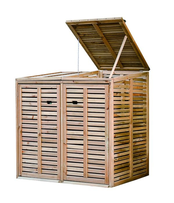- Drewniana osłona na kosze na śmieci na 3 pojemniki 120/240L, wykonana z sosny FSC® i zabezpieczona zielonym impregnatem wodnym. Posiada niezależnie otwierane pokrywy z łańcuszkami oraz przednie drzwiczki z zasuwkami, zapewniając wygodny dostęp i estetyczn