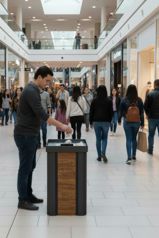 - Elegancki kosz metalowy ze wstawkami drewnopodobnymi, idealny do łazienek w restauracjach, hotelach i galeriach. Trwały, stylowy i łatwy w utrzymaniu czystości — świetnie łączy funkcjonalność z nowoczesnym designem.