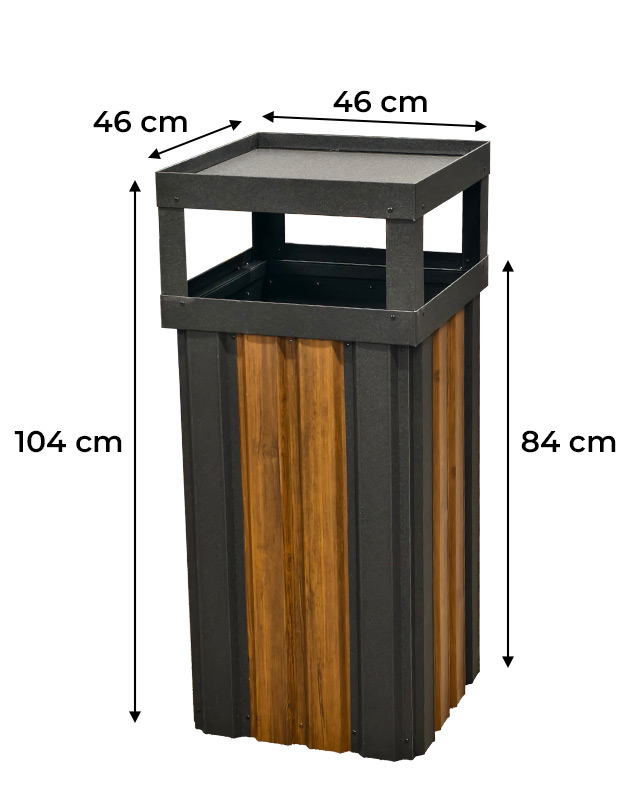 Stylowy i funkcjonalny kosz na śmieci z wbudowaną popielniczką to praktyczne rozwiązanie do miejsc wymagających estetyki, trwałości oraz wysokiego standardu wykończenia. Dzięki połączeniu nowoczesnej konstrukcji z eleganckimi panelami imitującymi drewno, doskonale sprawdzi się w przestrzeniach komercyjnych i reprezentacyjnych – takich jak lobby hotelowe, biura, restauracje, kawiarnie, centra handlowe czy obiekty użyteczności publicznej.