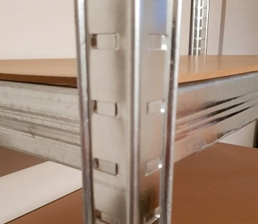 Największą zaletą regału jest wzmocniony profil z wytłoczeniami na obrzeżach nóg, co znacząco zwiększa odporność konstrukcji na obciążenie. Dzięki temu regał jest bardziej stabilny i bezpieczny w użytkowaniu niż modele z gładkimi bokami.
