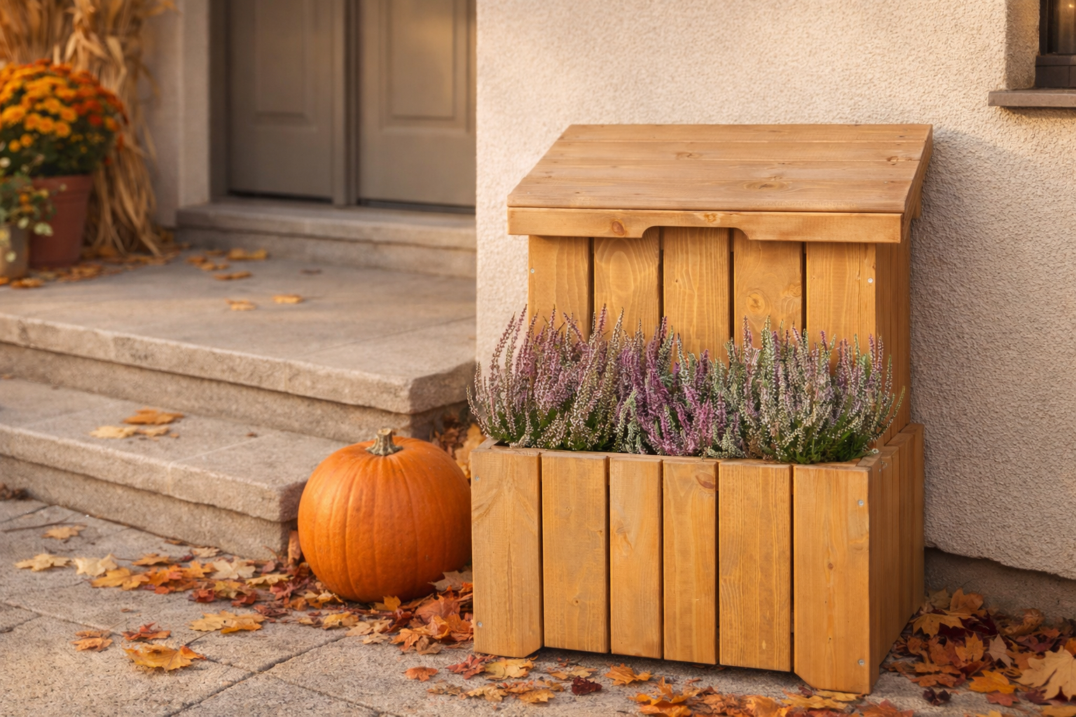 Stylowa i funkcjonalna skrzynia ogrodowa z donicą to praktyczne rozwiązanie do strefy wejściowej domu, ogrodu lub tarasu. Łączy estetykę naturalnego drewna z funkcjonalnością przechowywania i dekoracyjnej zieleni.