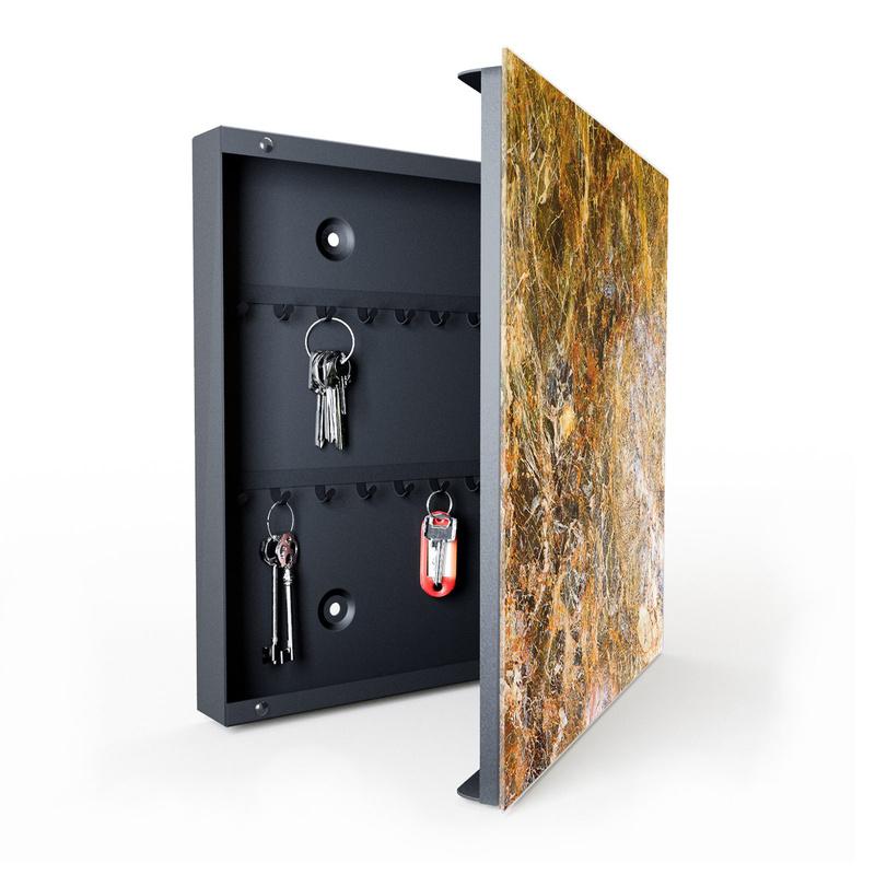 Front kasetki na klucze jest w technice laminowania, grafika znajduje się pod szkłem.