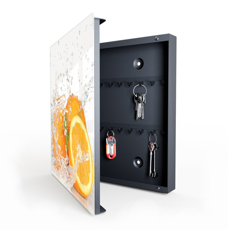 Front kasetki na klucze jest w technice laminowania, grafika znajduje się pod szkłem.