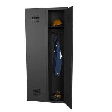 - Solidna szafa ubraniowa, malowana proszkowo na kolor czarny RAL 7016. Przeznaczona do warsztatów, magazynów i szatni pracowniczych. Wyposażona w półkę, drążek na odzież oraz otwory wentylacyjne w drzwiach.